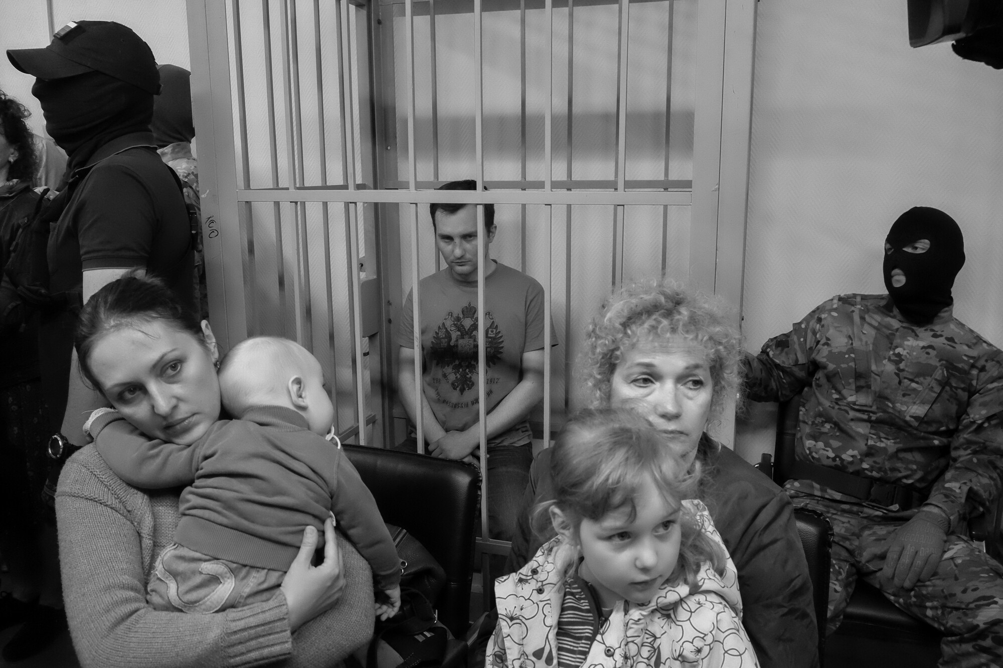 Photographs from the courtroom show how this judicial theater works. The defendant, Aleksandr Orshulevich, stands in a cage. Nearby are his wife and children. In the same room are masked officers. What is formally supposed to be a legal procedure looks instead like a scene of force in which the family itself becomes part of the pressure. The seats are filled not with ordinary citizens but with police cadets. According to the defense, and to Orshulevich himself, his detention involved humiliation, violence, and the use of force and special means.