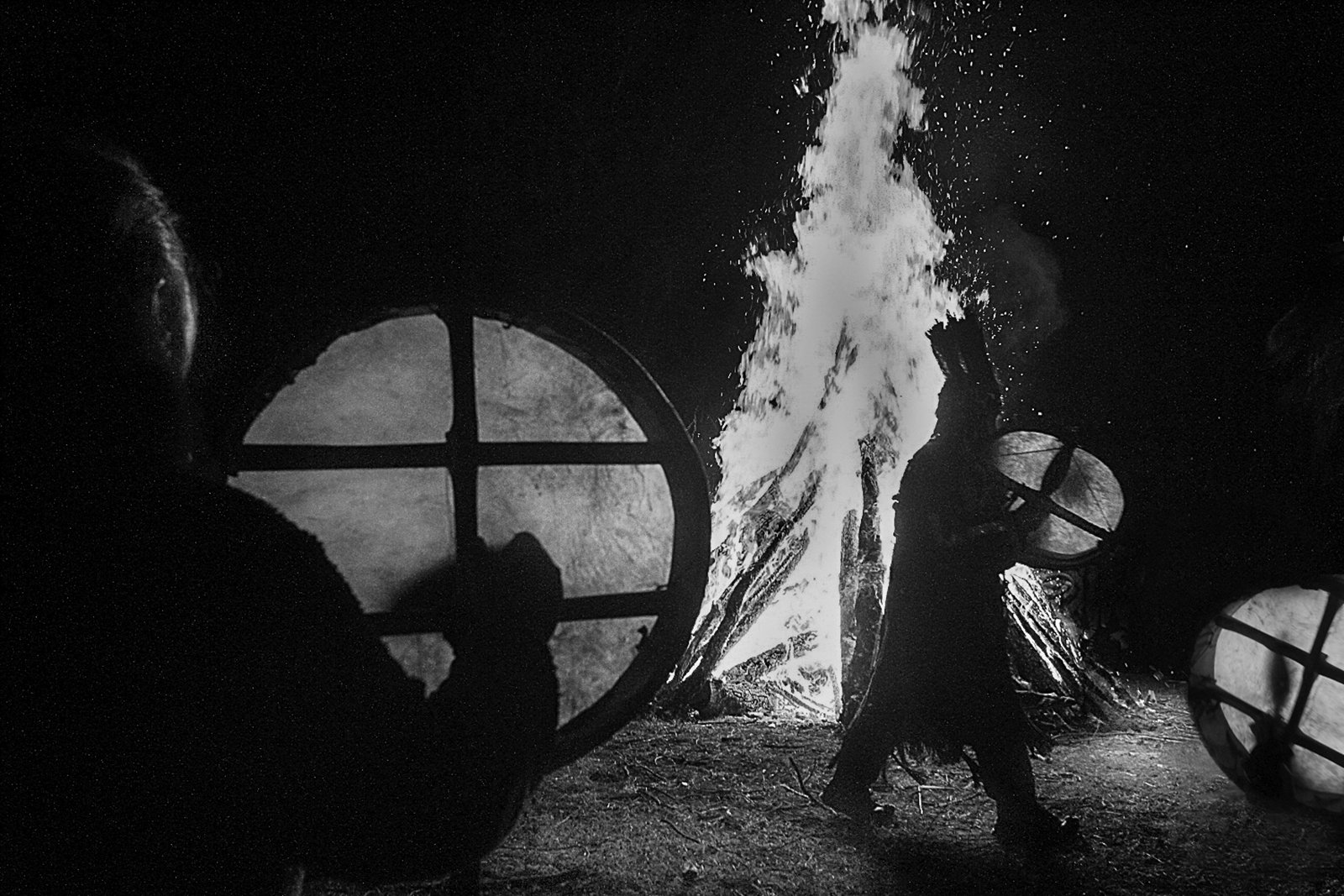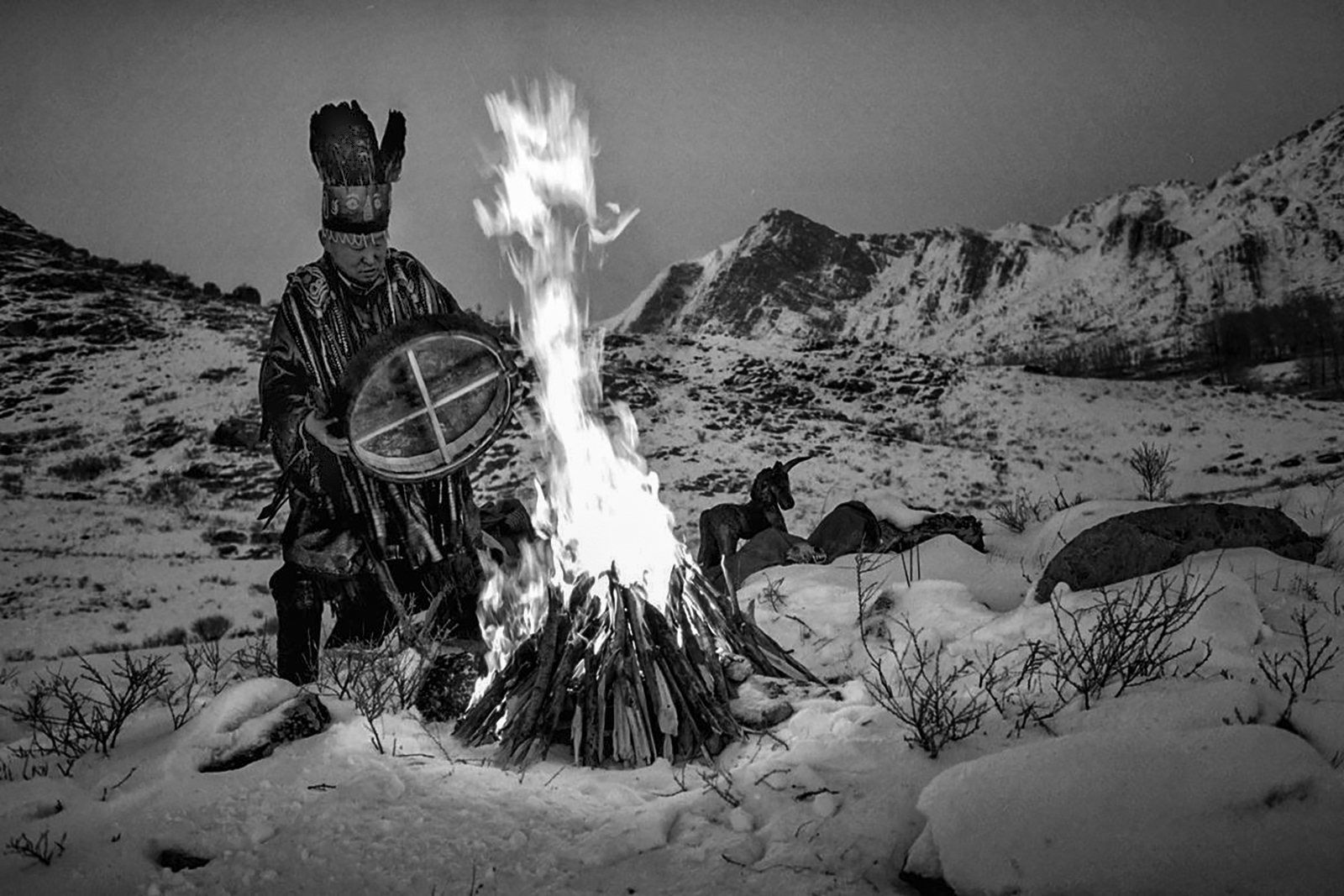 All in silence. Nature itself seemed muted — no wind, no birds. Only crackling wood and the shaman’s strange vocalizations: somewhere between “woo-woo-woo” and “ho-ho-ho.” He unwrapped his costume, then his tambourine, warming its frozen skin by the fire. Then he began to speak with the flames.